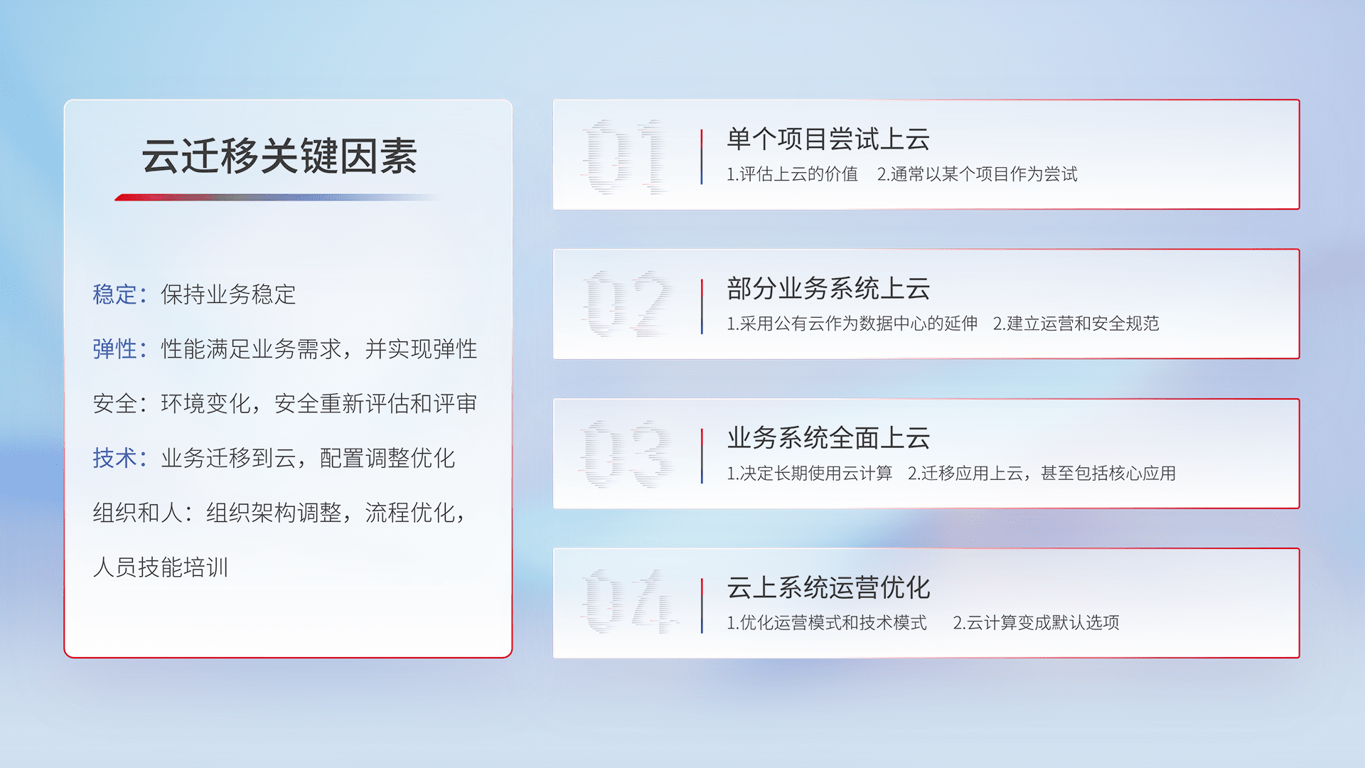 结合实际业务,,,,从规划设计、、、、云平台选型、、、、云原生改造、、数据迁移、、集成交付,,迁移全过程为客户识别最佳上云路径,,,,做好风险识别管理,,设计网络架构、、、身份权限、、、安全审计合规、、操作审计、、、日志审计、、、、监控告警策略、、、多站点容灾设计等,,,,对云上基础设施进行整体规划,,提升IT治理水平,,,,以满足弹性、、、、高可用、、高性能的需求。。