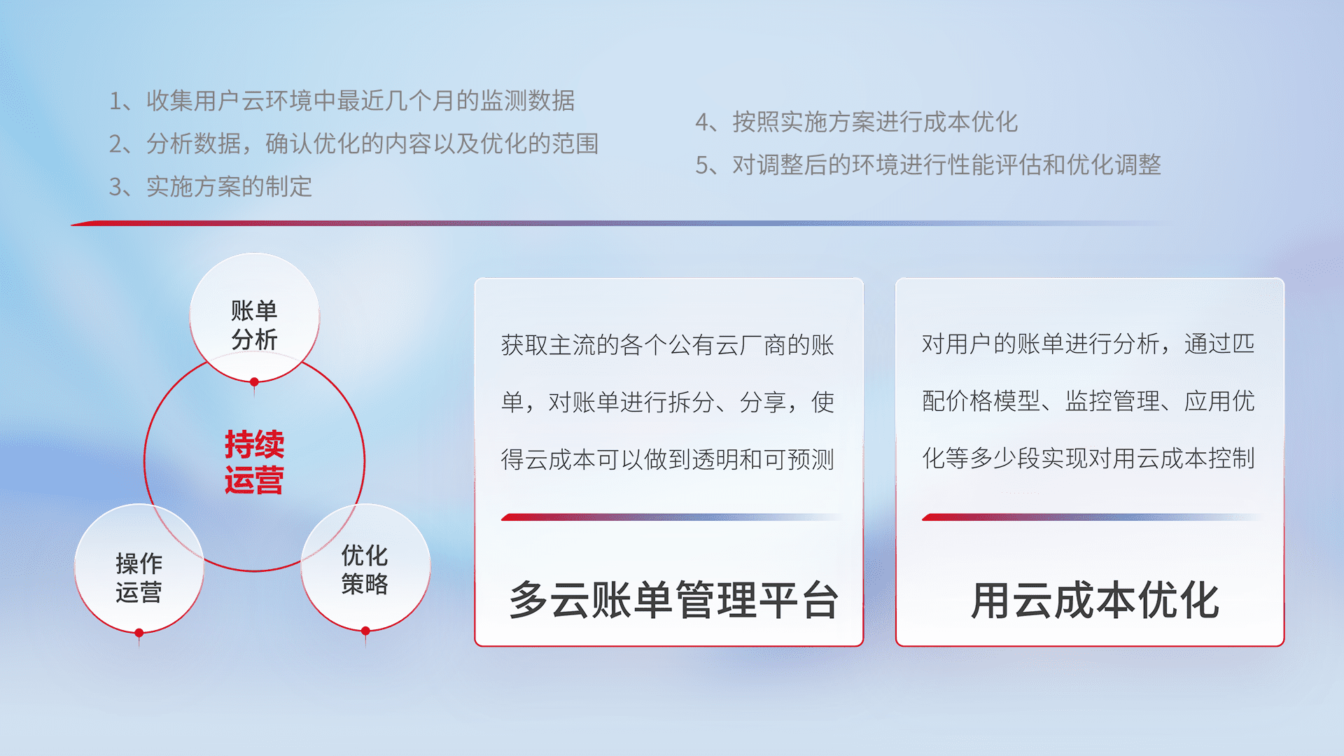 通过多云纳管,,,以统一的资源数据模型把客户的云资源进行抽象和封装,,,,进而实现对多云资源的统一操作,,,保障云资源管理的可靠性、、稳定性与可用性。。。量身定制化运维内容,,,配置、、开发运维、、、、补丁管理、、、、备份、、监控、、认证和访问管理、、审计和日常巡检等,,,,保障在用云过程中的可靠度,,,稳定度以及高可用率。。。