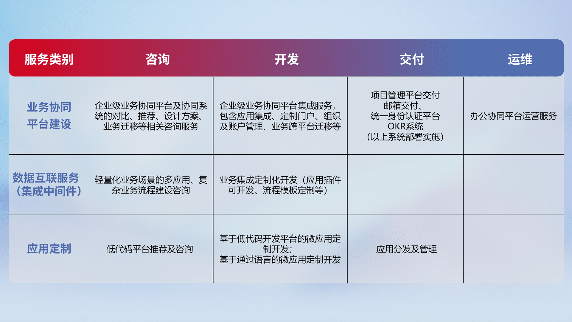 针对钉钉、、、、企微、、IDaas等平台级产品提供产品的规划、、方案、、交付、、、、定制化开发等服务,,,,实现如统一协同办公、、、智能客户服务、、、混合会议管理、、、智能数据查询、、、等业务场景,,,实现数字化转型。。。